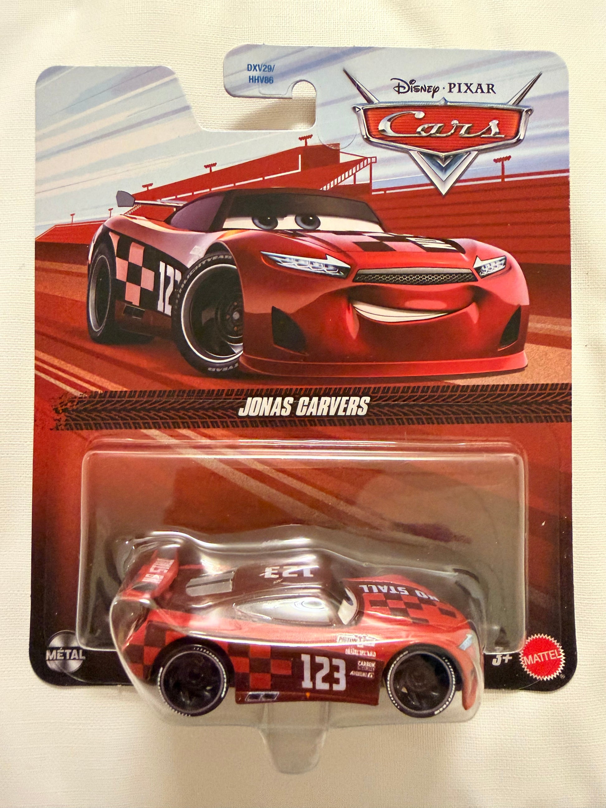 Jonas Carvers is a next-generation Piston Cup racer who becomes the No Stall team's driver after Todd Marcus retires, taking over car number 123 as a mid-season replacement. He sports a striking red, maroon, black, and white livery with a checkerboard pattern on his hood and sides, rides on Lightyear tires with white trim, and features a spoiler similar to other Next-Gen racers.