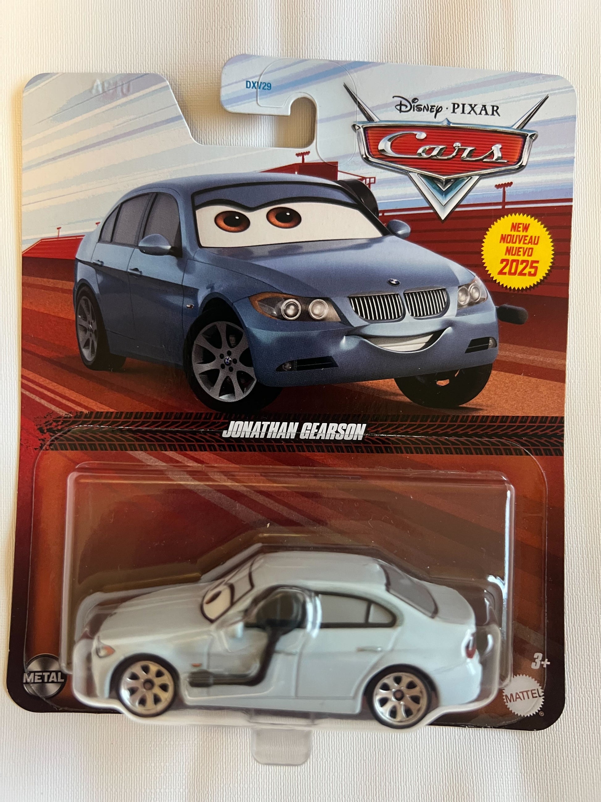 Jonathan Gearson is a character from Pixar's Cars on the Road, specifically featured in the episode "B-Movie." She is the assistant director for the fictional film Attack of the Space Zombies from Planet B, working under director Bella Cadavre. Jonathan is depicted as a blue-gray BMW 3-Series with brown eyes, embodying a professional and organized demeanor typical of an assistant director on a film set. Her character's name is a playful nod to Pixar employee Jonathan Garson, though the name "Jonathan" is traditionally male, while the character is female. Interestingly, Jonathan shares the same model as Scott Motorse, a character from Cars 2 who appears in England. Before her 2025 diecast release, Jonathan was referred to simply as "1st AD," an abbreviation for Assistant Director.