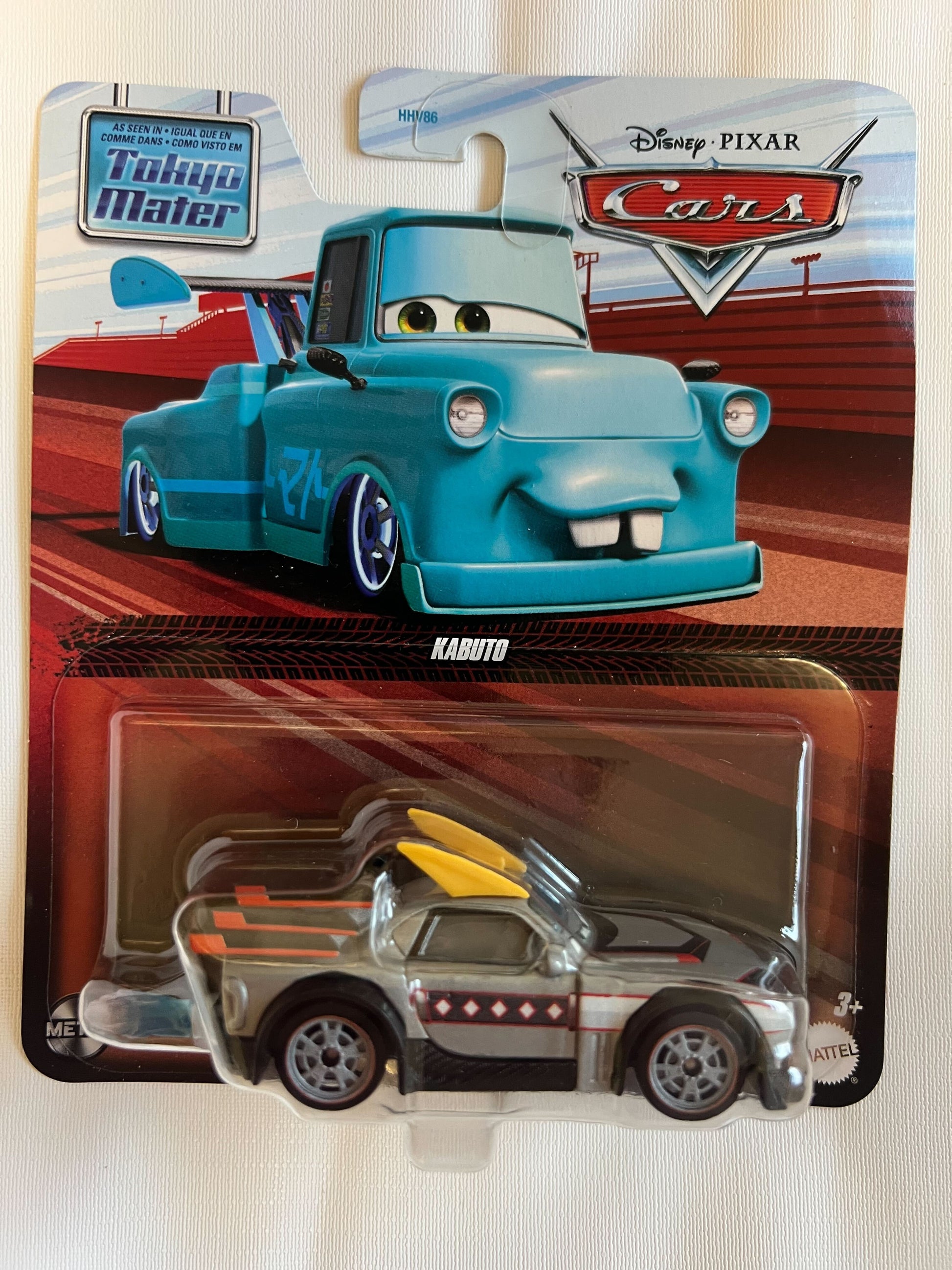 Kabuto is the main antagonist in Pixar's Cars Toons: Tokyo Mater. A highly modified gray 1994 Mitsubishi Eclipse, he is a skilled drifter and self-proclaimed "king of Tokyo's streets." Kabuto challenges Mater to a drift race after a minor collision, with the loser facing the humiliation of being stripped of all modifications and returned to "stock" form. Despite his arrogance and flashy design, Kabuto loses the race, leading to his modifications being removed, symbolizing the episode's theme of humility and the value of authenticity.