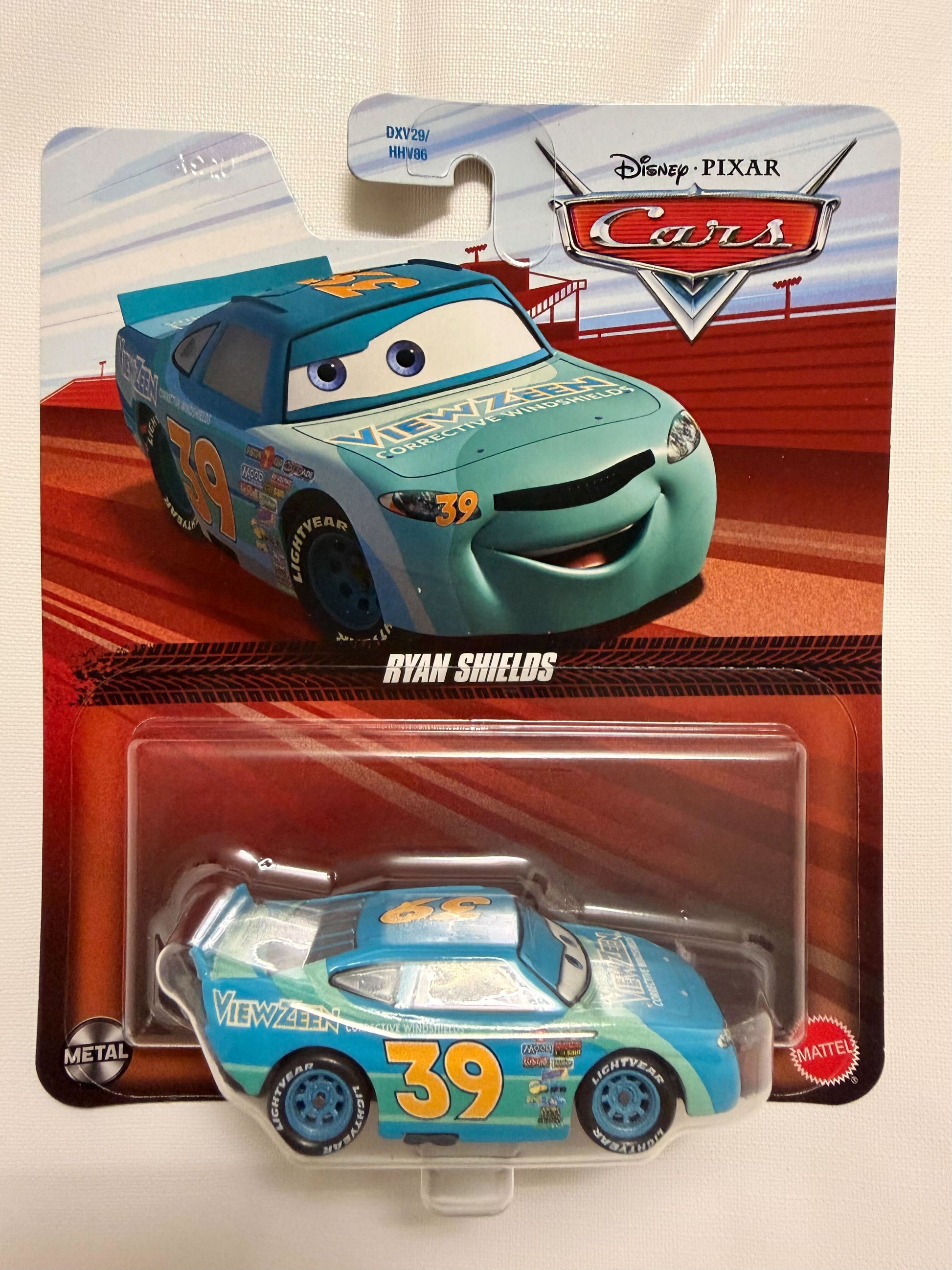 Ryan Shields is a race car from Pixar's Cars franchise, competing for the View Zeen team in the Piston Cup. He is a turquoise Crown Celesta with orange number 39 decals and the View Zeen logo prominently displayed on his hood and fenders. Ryan participated in the 2006 Dinoco Light 350 but was involved in a massive crash caused by Chick Hicks at the Motor Speedway of the South. Following the incident, he retired from racing and was succeeded by Buck Bearingly. Ryan's character adds depth to the Cars universe, highlighting the transient nature of racing careers and the impact of pivotal events on a racer's journey.